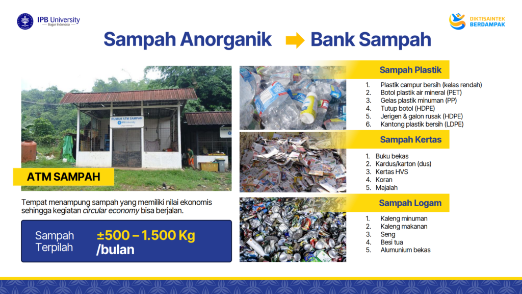 1. Sampah Organik : Sampah Daun Serasah, Sampah Hasil Babadan Rumput, Rumen/Kotoran Sapi, Sampah Sisa Makanan, dan Sampah organik Lainnya. Jenis sampah tersebut diolah menjadi kompos, biogas, dan pakan maggot;