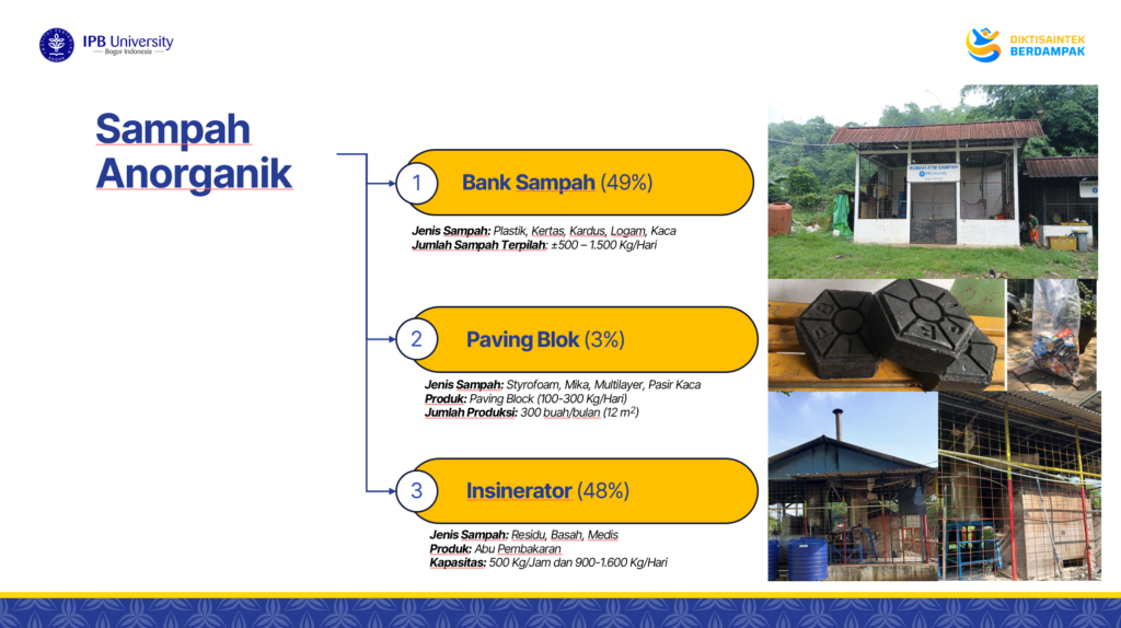 2. Sampah Anorganik : Kertas Tercampur, Berbagai Jenis Plastik, Styrofoam, Kaca/Botol, Kaleng/Besi, dan Sampah Anorganik Lainnya. Jenis sampah tersebut diolah menjadi sebagai bahan baku produk daur ulang oleh Bank Sampah, diproses melting menjadi Paving Block, dan sisanya diproses thermal insinerator;